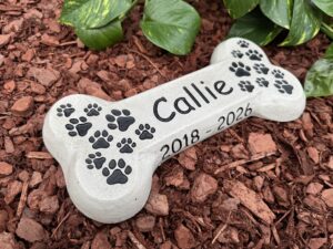 Honor your beloved pet with a timeless, handcrafted memorial marker made to last. Each marker is cast from durable cement, then sandblasted to permanently etch your pet’s name and details directly into the surface—no vinyl, no decals, and nothing that will peel or fade over time.